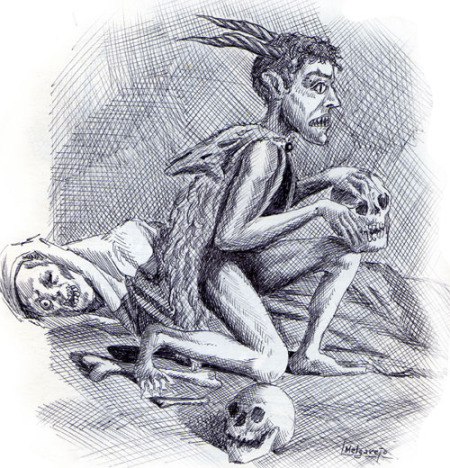 Era creencia popular en Delfos (Grecia) que este ser infernal devoraba la carne de los muertos, dejando sólo los huesos. En la “estela” de esa misma ciudad (monumento conmemorativo que se erige sobre el suelo en forma de lápida, pedestal o cipo) dicho ente estaba representado con alas de buitre y afilados dientes parecidos a los de un tigre.